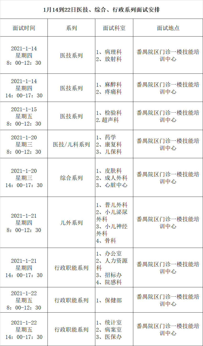 我院2021年招聘医技、综合、行政系列列第一次面试已经开始。根据岗位招聘条件和应聘者情况,经过初步筛选,我院拟安排于2020年1月14日-22日进行第一批集中面试,请收到短信通知或在应聘qq群见到名单的应聘者参加面试,按照通知要求准备面试材料,现将有关事宜通知如下: