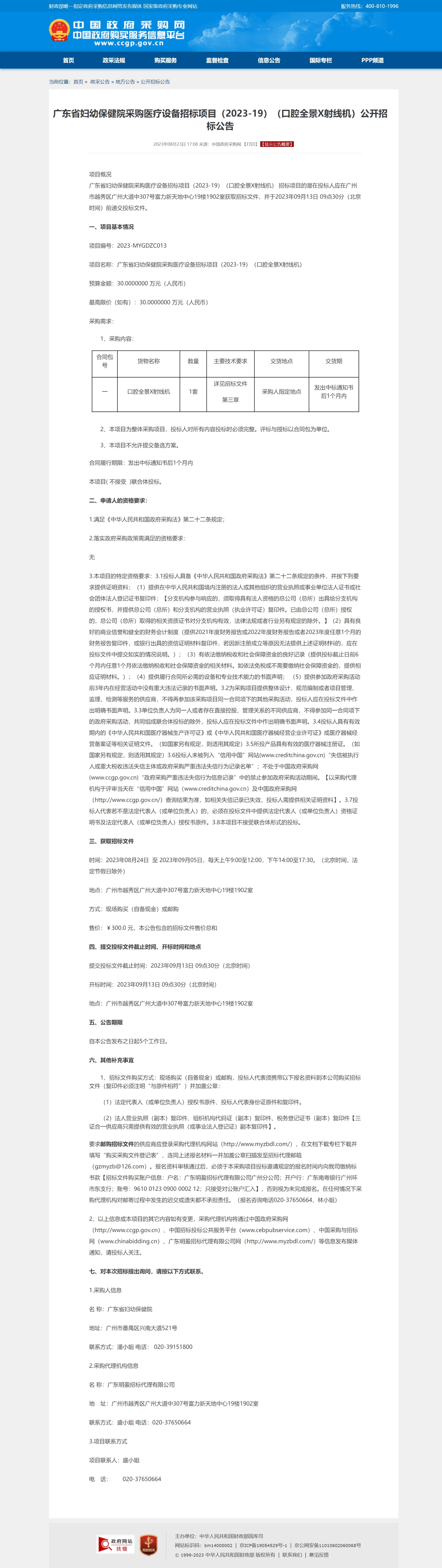 广东省妇幼保健院采购医疗设备招标项目(2023-19)(口腔全景X射线机) 招标项目的潜在投标人应在广州市越秀区广州大道中307号富力新天地中心19楼1902室获取招标文件,并于2023年09月13日 09点30分(北京时间)前递交投标文件。