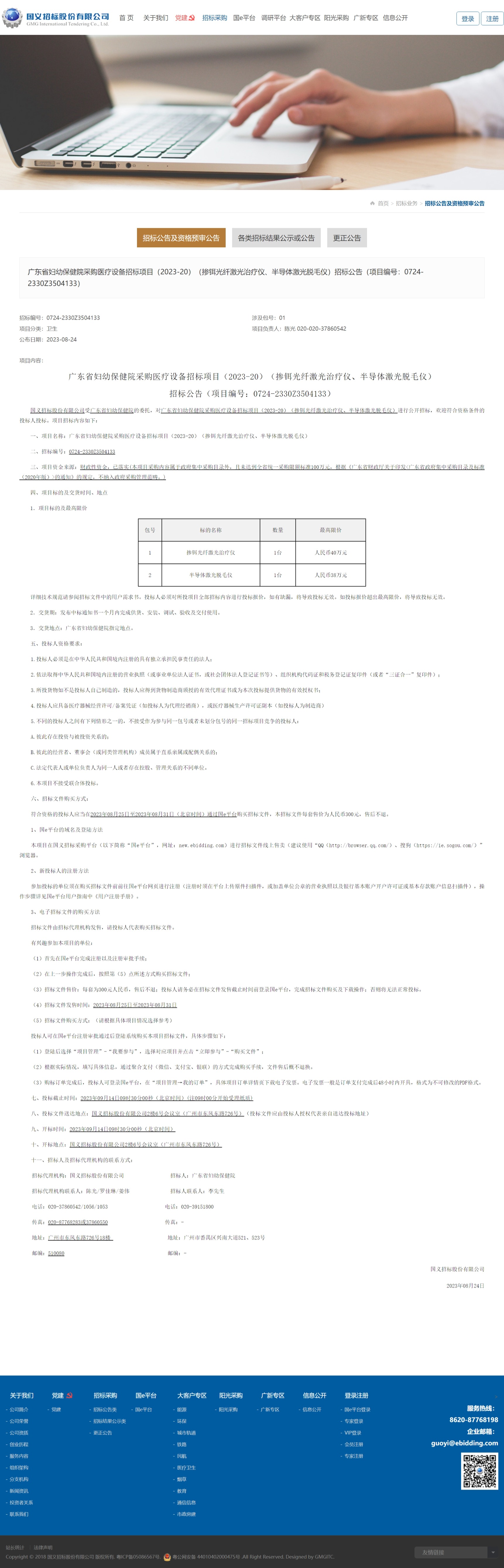 国义招标股份有限公司受广东省妇幼保健院的委托,对广东省妇幼保健院采购医疗设备招标项目(2023-20)(掺铒光纤激光治疗仪、半导体激光脱毛仪)进行公开招标,欢迎符合资格条件的投标人投标。项目招标内容如下:
