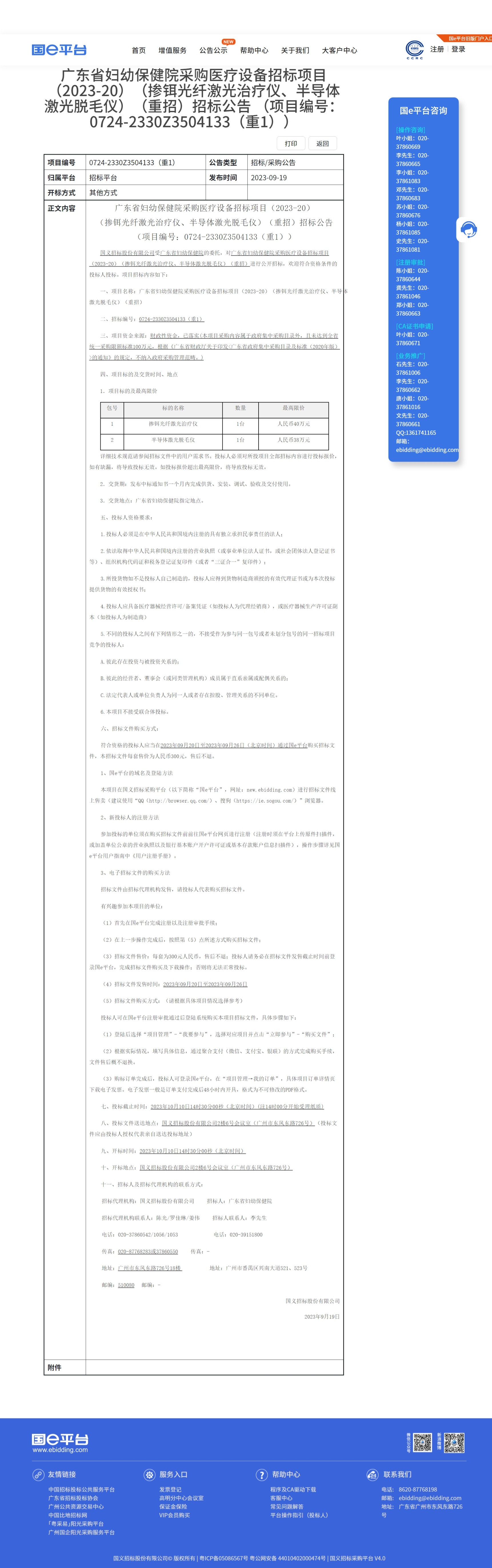 国义招标股份有限公司受广东省妇幼保健院的委托,对广东省妇幼保健院采购医疗设备招标项目(2023-20)(掺铒光纤激光治疗仪、半导体激光脱毛仪)(重招)进行公开招标,欢迎符合资格条件的投标人投标。项目招标内容如下: