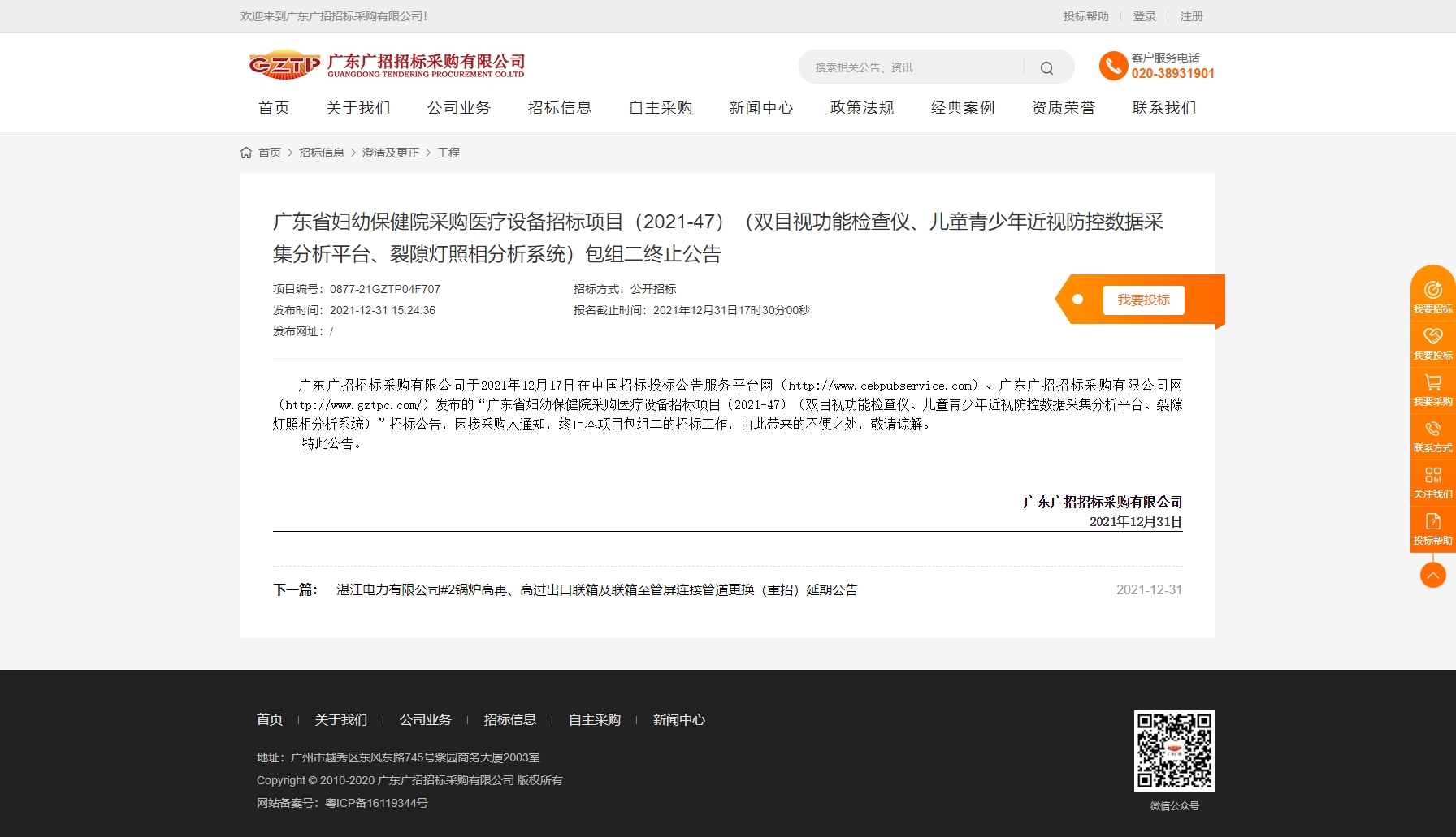 广东广招招标采购有限公司于2021年12月17日在中国招标投标公告服务平台网(http://www.cebpubservice.com)、广东广招招标采购有限公司网(http://www.gztpc.com/)发布的“广东省妇幼保健院采购医疗设备招标项目(2021-47)(双目视功能检查仪、儿童青少年近视防控数据采集分析平台、裂隙灯照相分析系统)”招标公告,因接采购人通知,终止本项目包组二的招标工作,由此带来的不便之处,敬请谅解。
