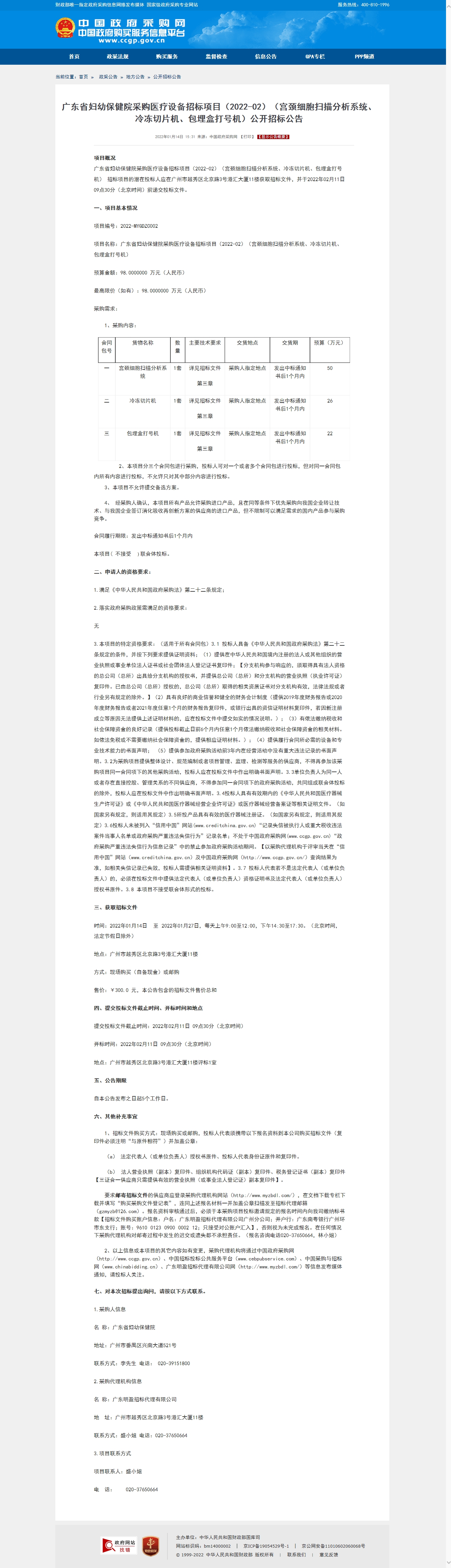 广东省妇幼保健院采购医疗设备招标项目(2022-02)(宫颈细胞扫描分析系统、冷冻切片机、包埋盒打号机)公开招标公告