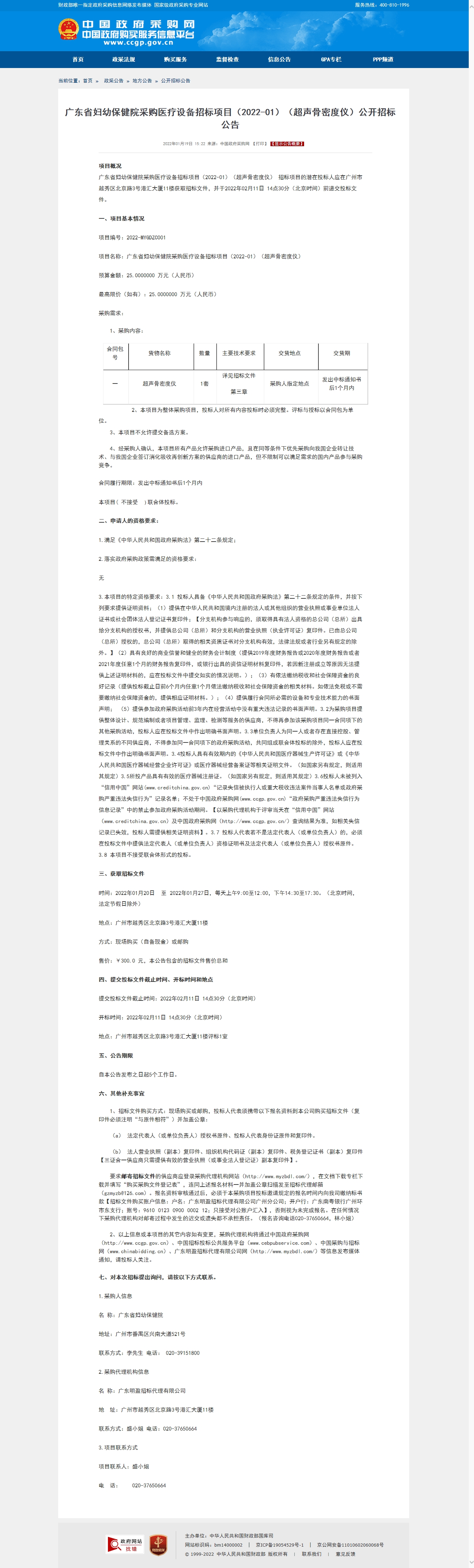 项目名称:广东省妇幼保健院采购医疗设备招标项目(2022-01)(超声骨密度仪)
