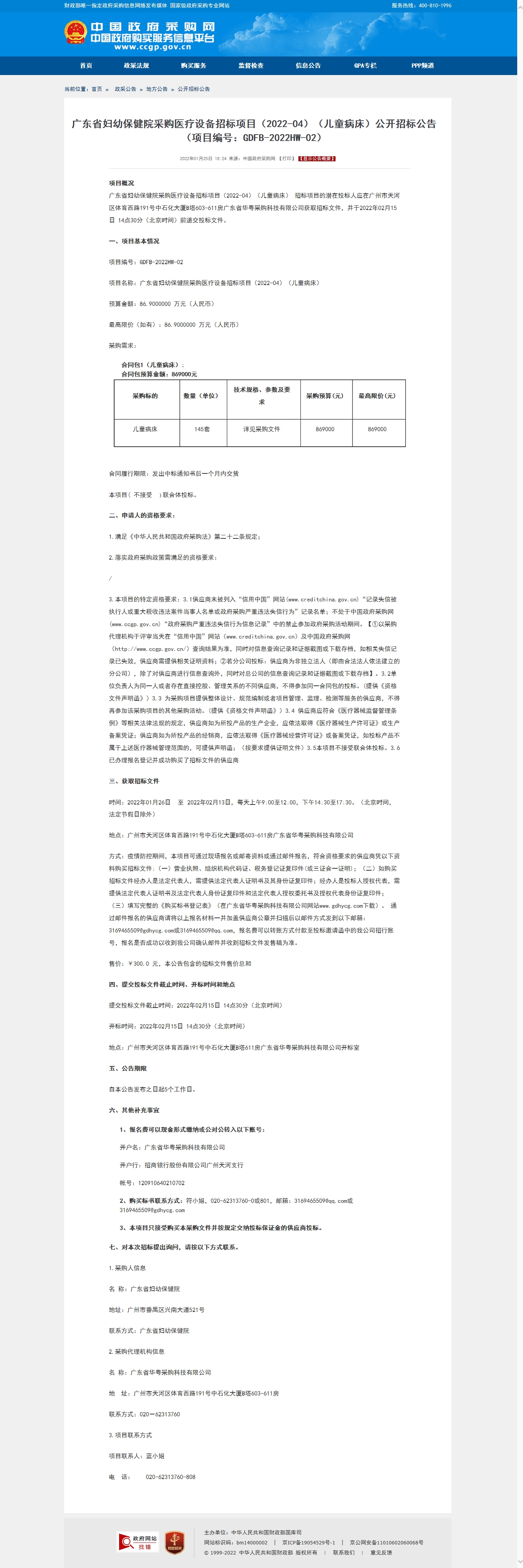 广东省妇幼保健院采购医疗设备招标项目(2022-04)(儿童病床) 招标项目的潜在投标人应在广州市天河区体育西路191号中石化大厦B塔603-611房广东省华粤采购科技有限公司获取招标文件,并于2022年02月15日 14点30分(北京时间)前递交投标文件。