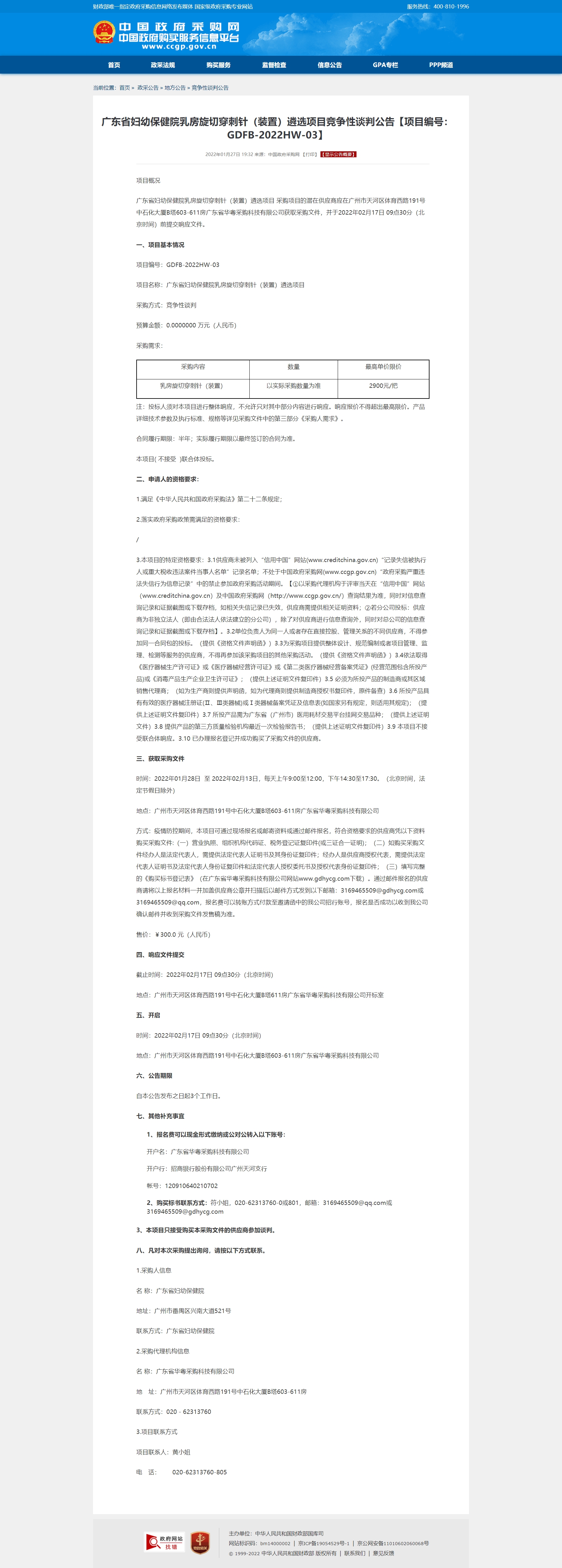 项目名称:广东省妇幼保健院乳房旋切穿刺针(装置)遴选项目
