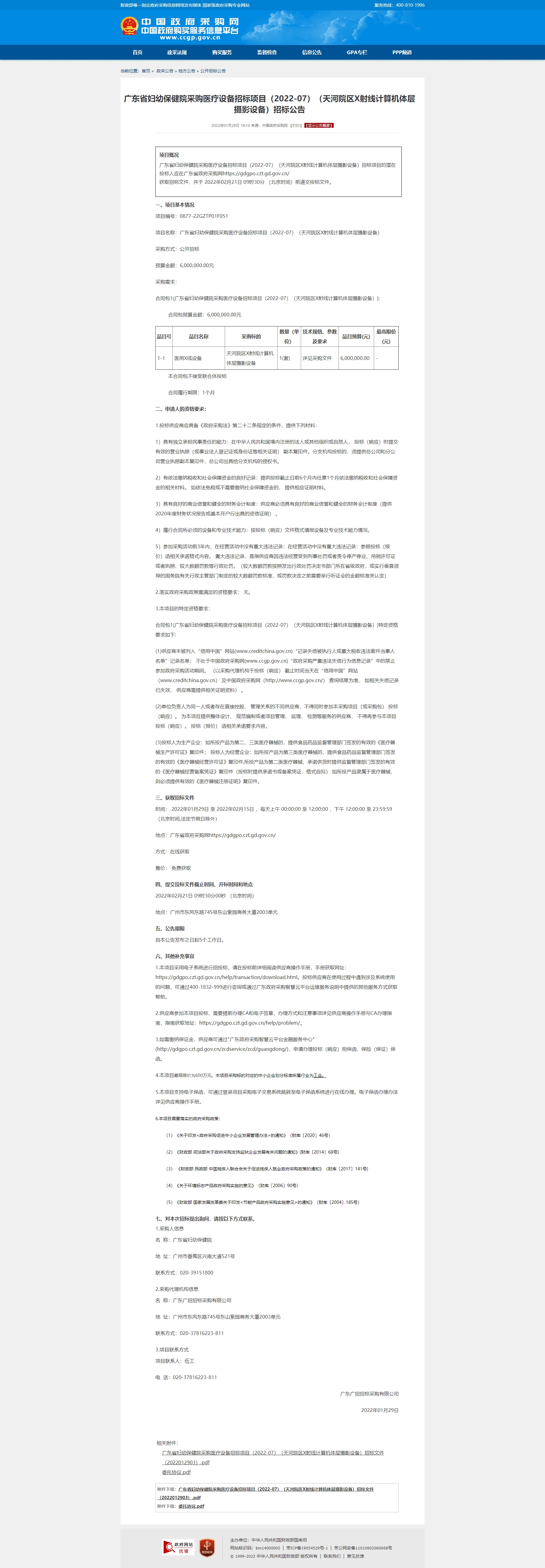 项目名称:广东省妇幼保健院采购医疗设备招标项目(2022-07)(天河院区X射线计算机体层摄影设备)