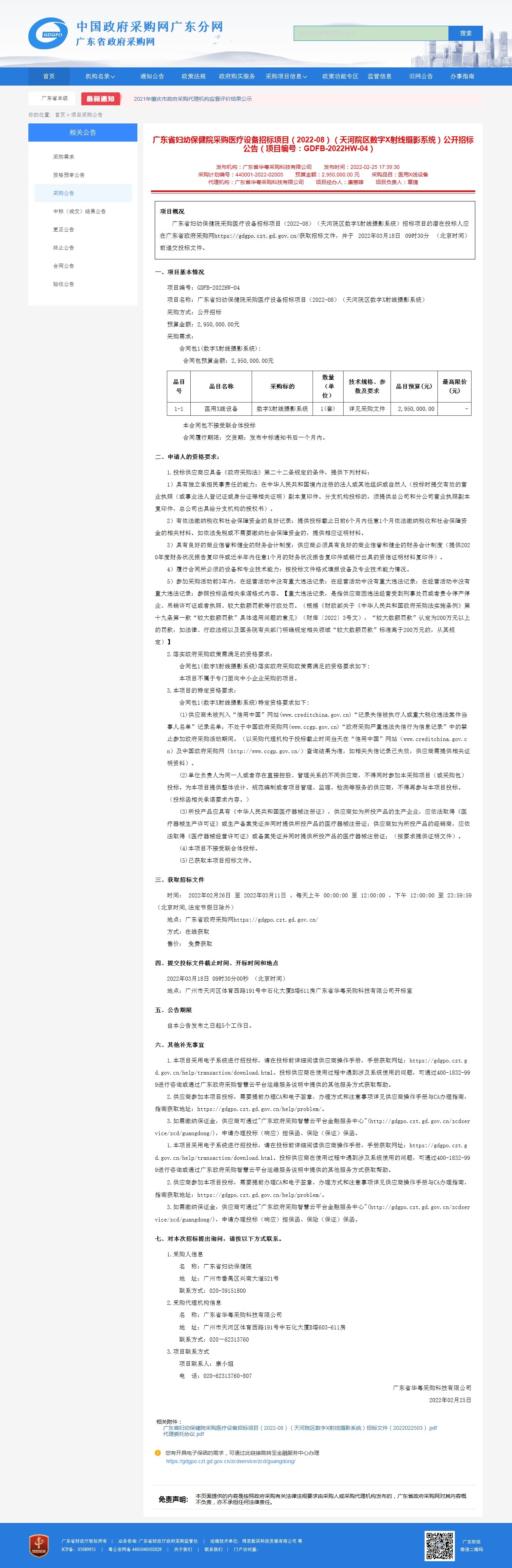 项目名称:广东省妇幼保健院采购医疗设备招标项目(2022-08)(天河院区数字X射线摄影系统)