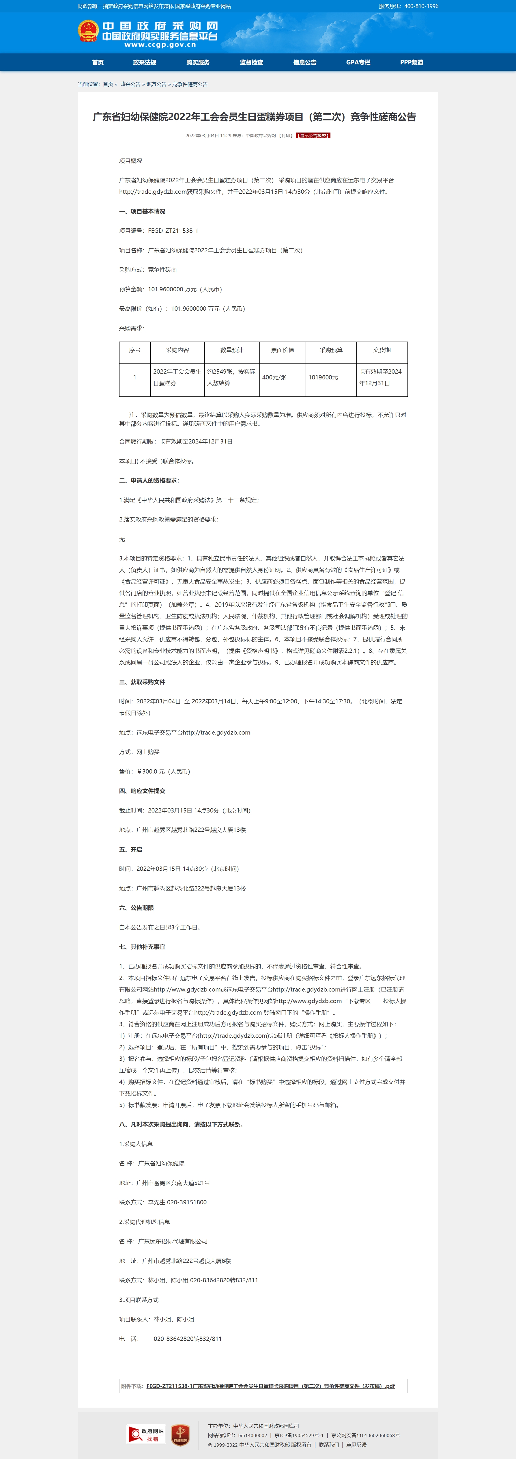 广东省妇幼保健院2022年工会会员生日蛋糕券项目(第二次) 采购项目的潜在供应商应在远东电子交易平台http://trade.gdydzb.com获取采购文件,并于2022年03月15日 14点30分(北京时间)前提交响应文件。