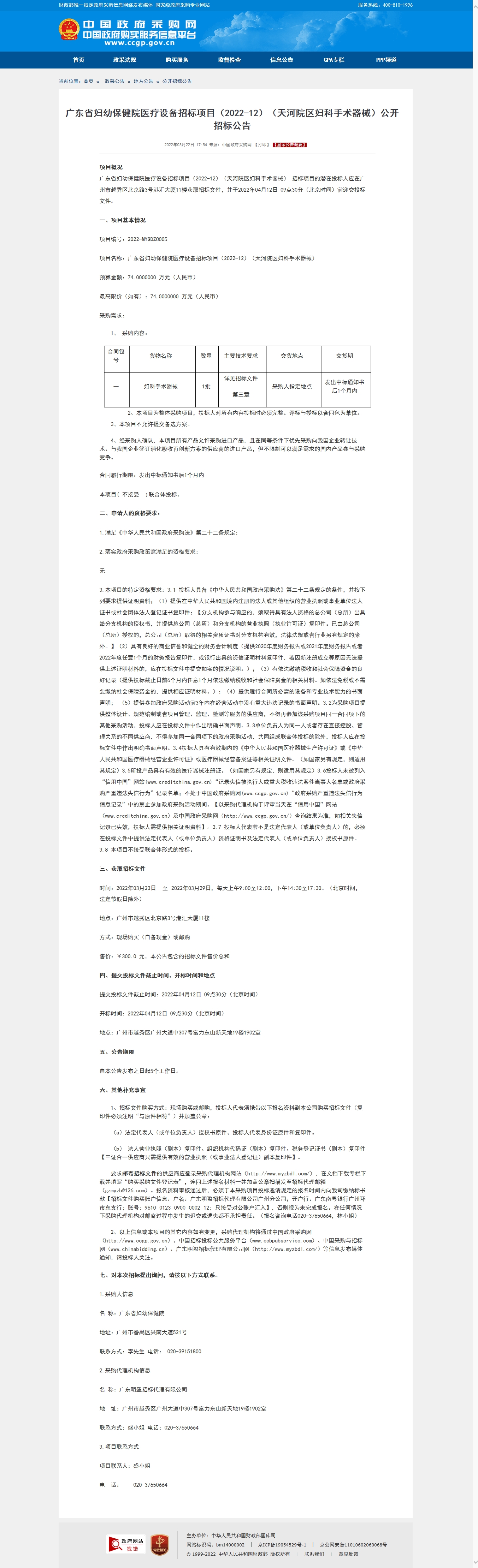 广东省妇幼保健院医疗设备招标项目(2022-12)(天河院区妇科手术器械) 招标项目的潜在投标人应在广州市越秀区北京路3号港汇大厦11楼获取招标文件,并于2022年04月12日 09点30分(北京时间)前递交投标文件。
