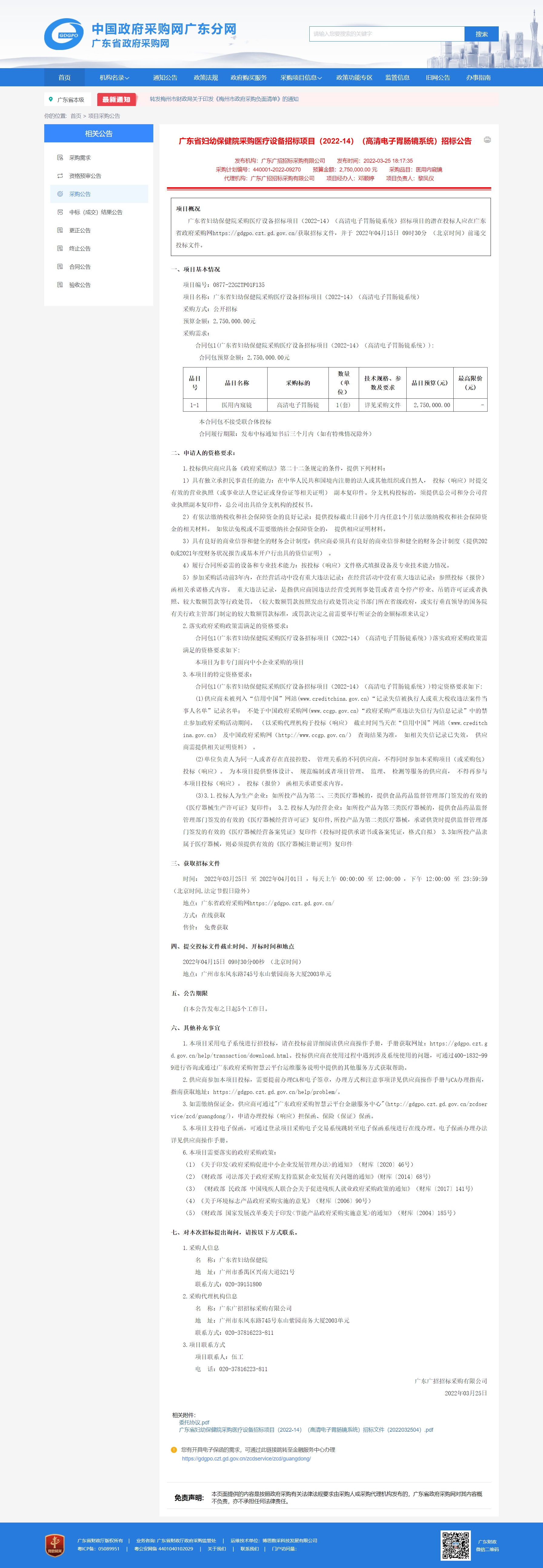 广东省妇幼保健院采购医疗设备招标项目(2022-14)(高清电子胃肠镜系统)招标公告