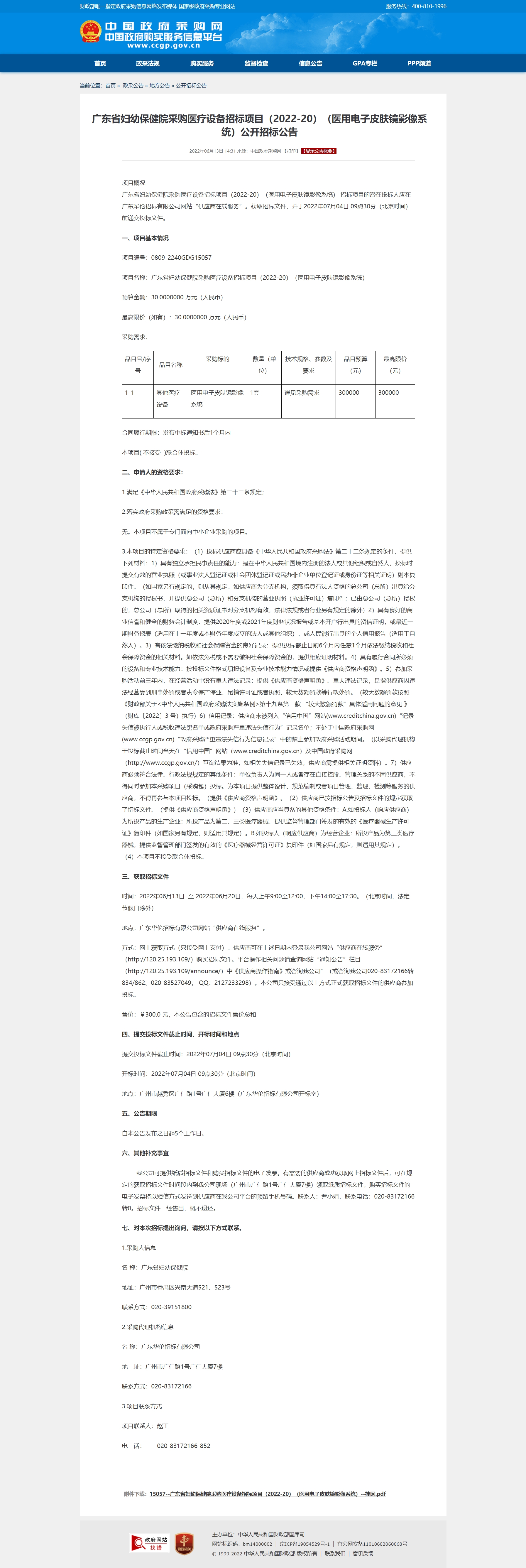 广东省妇幼保健院采购医疗设备招标项目(2022-20)(医用电子皮肤镜影像系统) 招标项目的潜在投标人应在广东华伦招标有限公司网站“供应商在线服务”。获取招标文件,并于2022年07月04日 09点30分(北京时间)前递交投标文件。