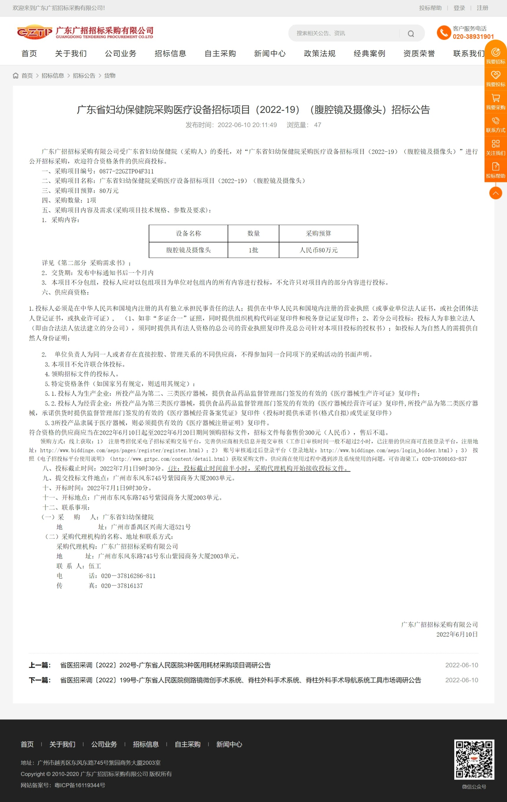 广东广招招标采购有限公司受广东省妇幼保健院(采购人)的委托,对“广东省妇幼保健院采购医疗设备招标项目(2022-19)(腹腔镜及摄像头)”进行公开招标采购,欢迎符合资格条件的供应商投标。