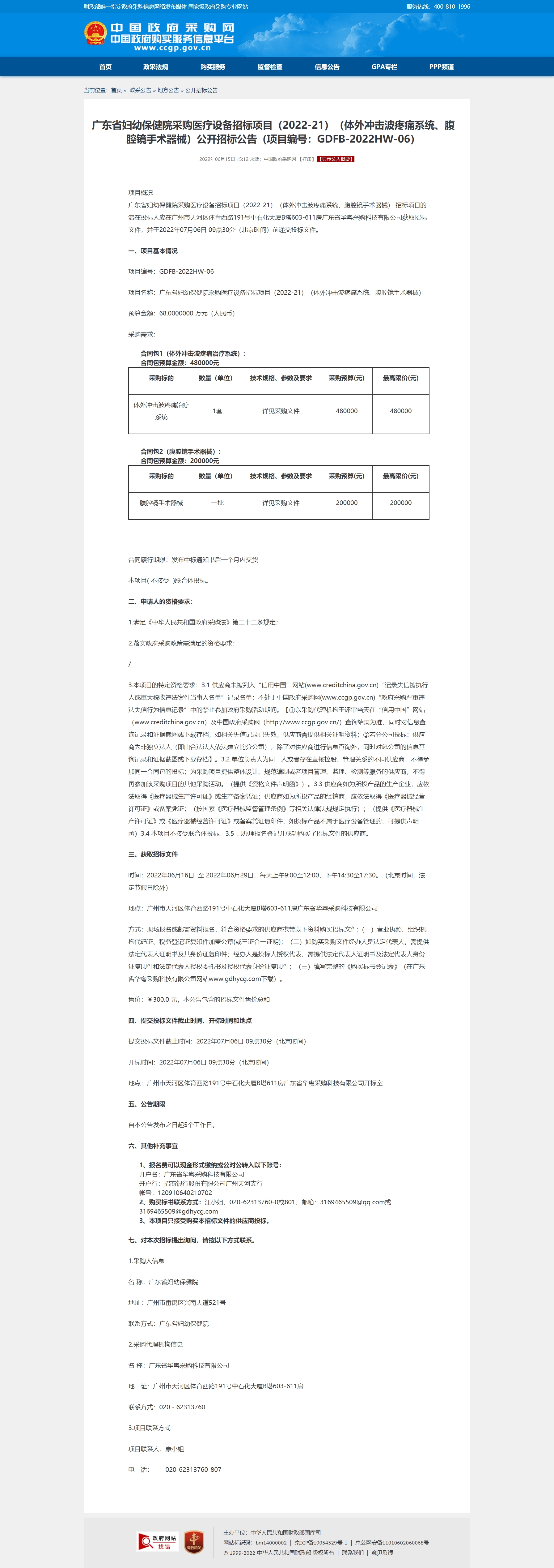 广东省妇幼保健院采购医疗设备招标项目(2022-21)(体外冲击波疼痛系统、腹腔镜手术器械) 招标项目的潜在投标人应在广州市天河区体育西路191号中石化大厦B塔603-611房广东省华粤采购科技有限公司获取招标文件,并于2022年07月06日 09点30分(北京时间)前递交投标文件。