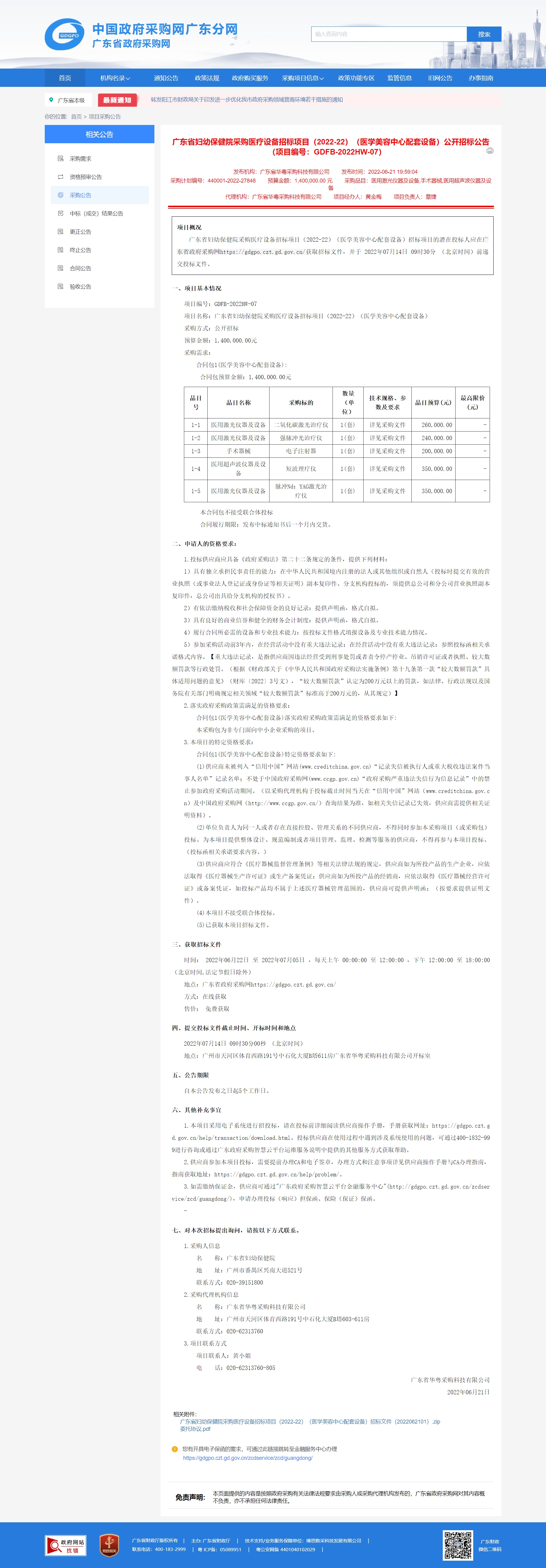 广东省妇幼保健院采购医疗设备招标项目(2022-22)(医学美容中心配套设备)招标项目的潜在投标人应在广东省政府采购网https://gdgpo.czt.gd.gov.cn/获取招标文件,并于 2022年07月14日 09时30分 (北京时间)前递交投标文件。