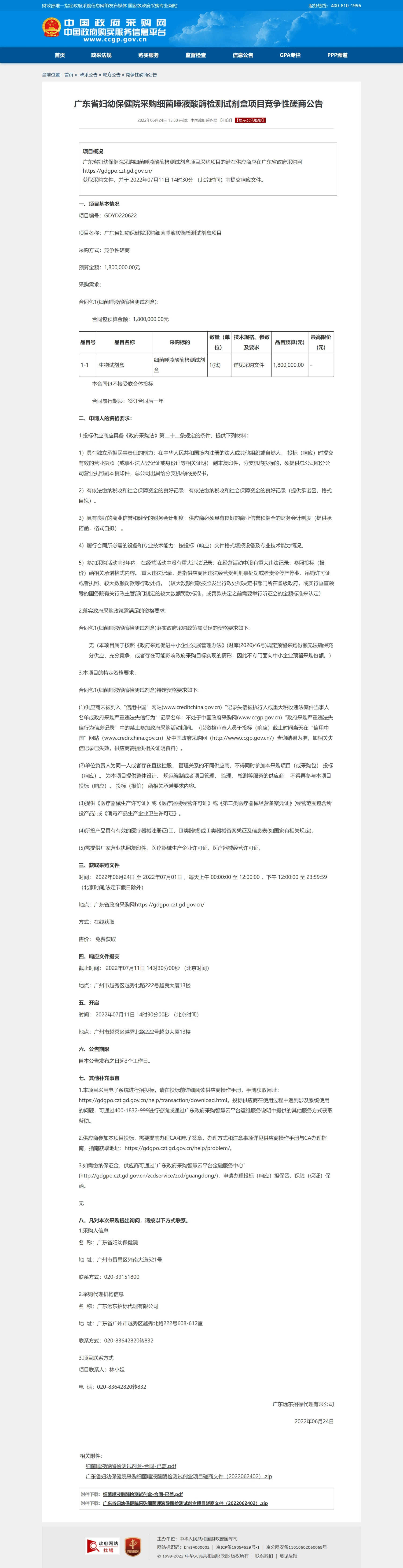广东省妇幼保健院采购细菌唾液酸酶检测试剂盒项目采购项目的潜在供应商应在广东省政府采购网https://gdgpo.czt.gd.gov.cn/获取采购文件,并于 2022年07月11日 14时30分 (北京时间)前提交响应文件。