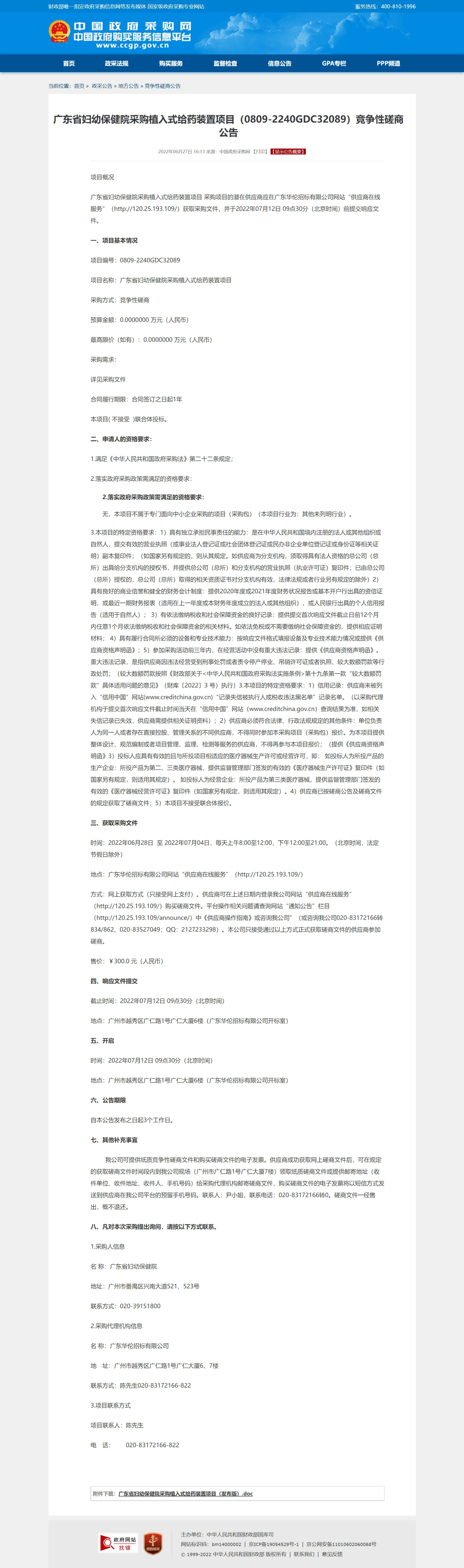 广东省妇幼保健院采购植入式给药装置项目 采购项目的潜在供应商应在广东华伦招标有限公司网站“供应商在线服务”(http://120.25.193.109/)获取采购文件,并于2022年07月12日 09点30分(北京时间)前提交响应文件。