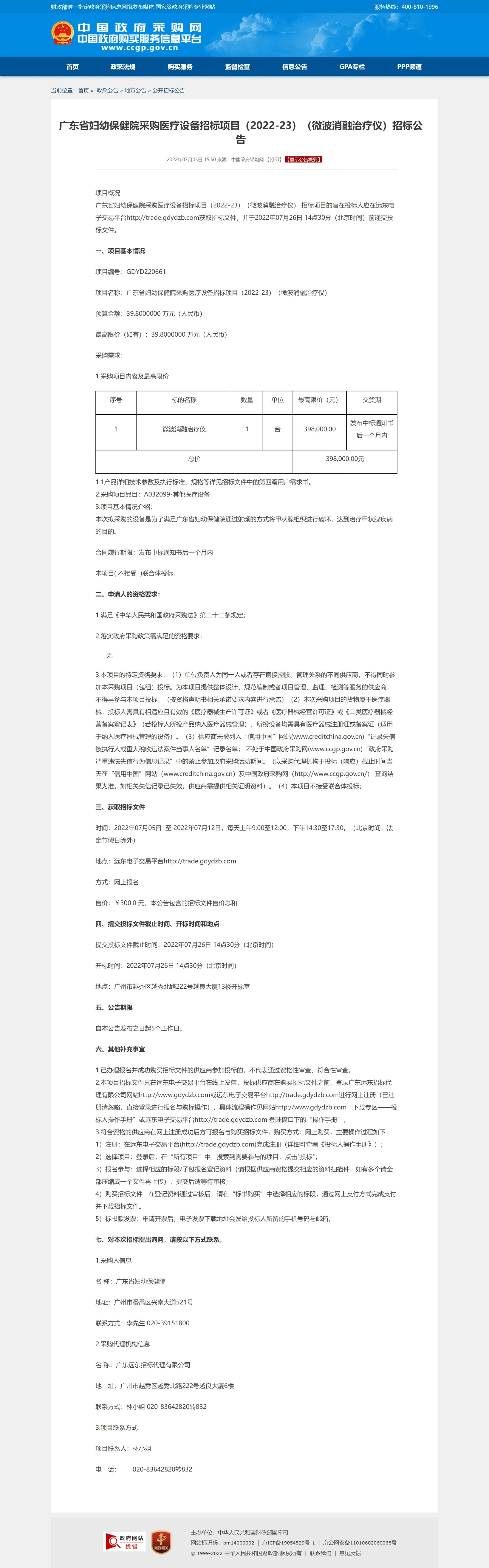 广东省妇幼保健院采购医疗设备招标项目(2022-23)(微波消融治疗仪) 招标项目的潜在投标人应在远东电子交易平台http://trade.gdydzb.com获取招标文件,并于2022年07月26日 14点30分(北京时间)前递交投标文件。
