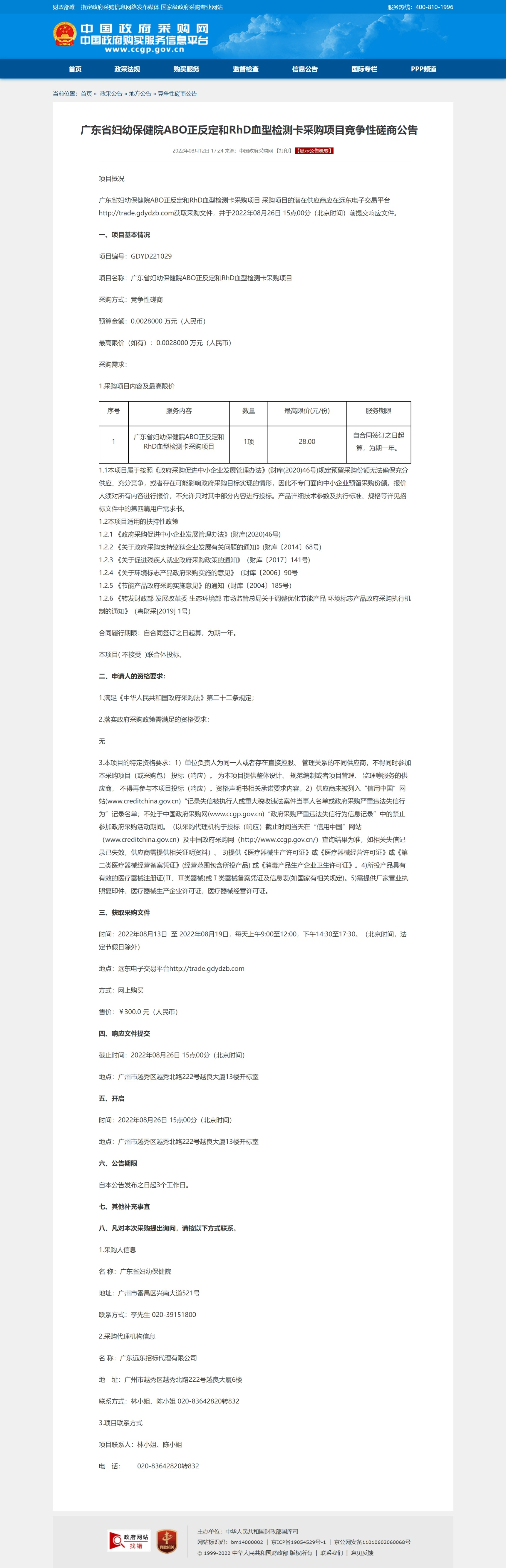 广东省妇幼保健院ABO正反定和RhD血型检测卡采购项目 采购项目的潜在供应商应在远东电子交易平台http://trade.gdydzb.com获取采购文件,并于2022年08月26日 15点00分(北京时间)前提交响应文件。