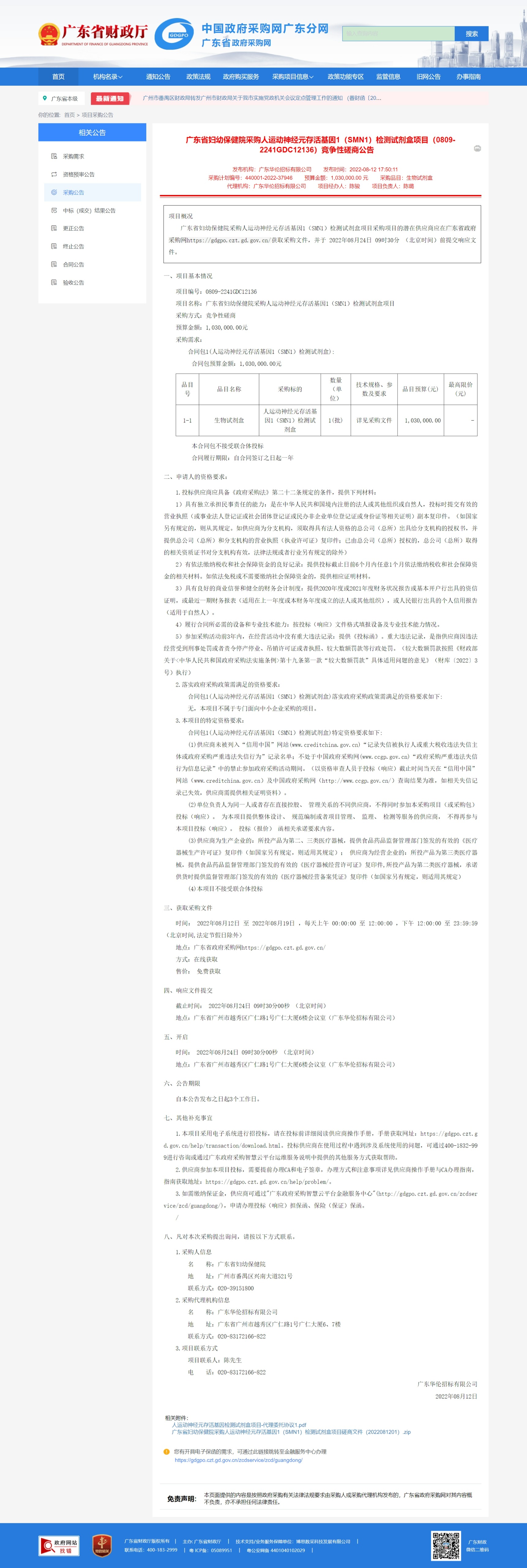 广东省妇幼保健院采购人运动神经元存活基因1(SMN1)检测试剂盒项目采购项目的潜在供应商应在广东省政府采购网https://gdgpo.czt.gd.gov.cn/获取采购文件,并于 2022年08月24日 09时30分 (北京时间)前提交响应文件。