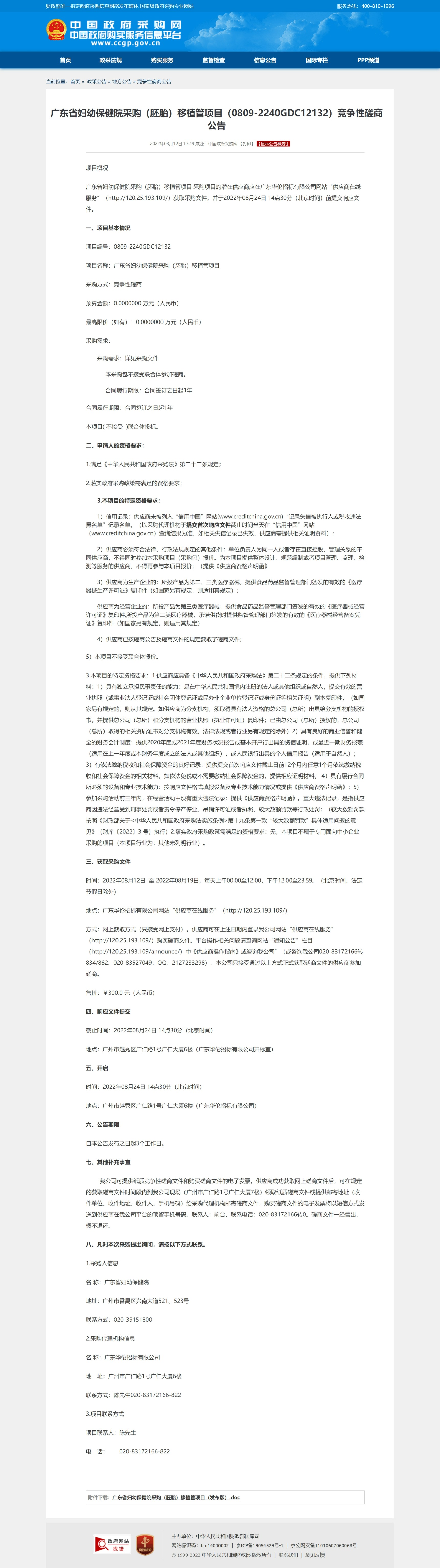 广东省妇幼保健院采购(胚胎)移植管项目 采购项目的潜在供应商应在广东华伦招标有限公司网站“供应商在线服务”(http://120.25.193.109/)获取采购文件,并于2022年08月24日 14点30分(北京时间)前提交响应文件。