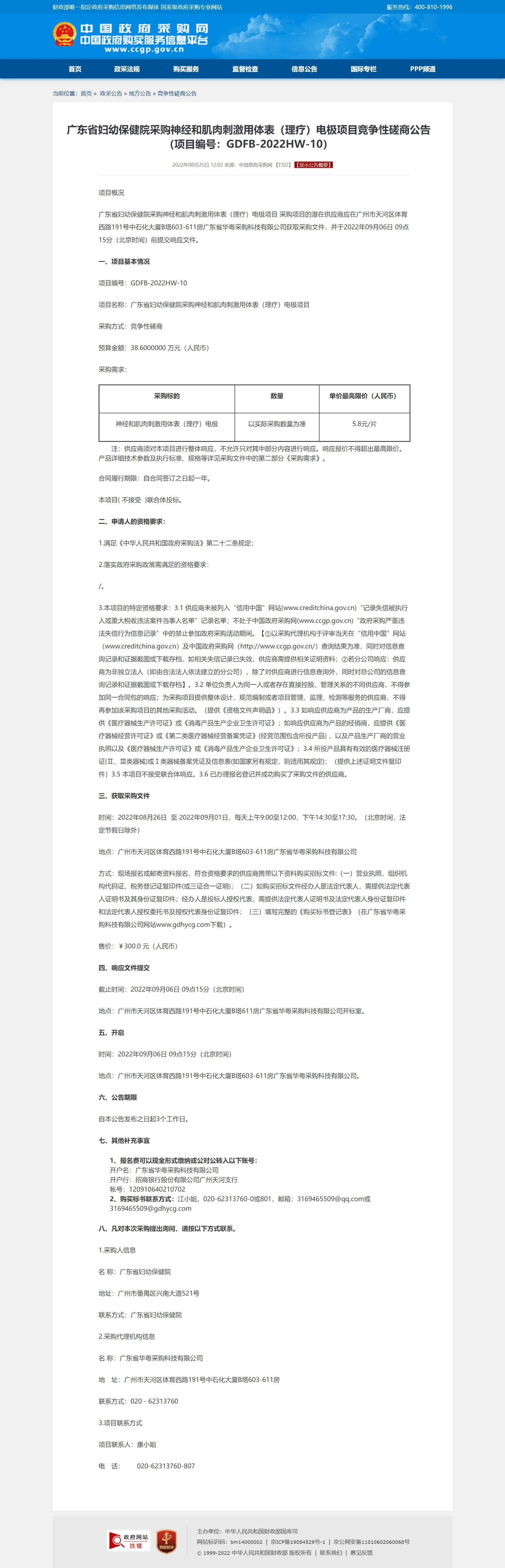 广东省妇幼保健院采购神经和肌肉刺激用体表(理疗)电极项目 采购项目的潜在供应商应在广州市天河区体育西路191号中石化大厦B塔603-611房广东省华粤采购科技有限公司获取采购文件,并于2022年09月06日 09点15分(北京时间)前提交响应文件。
