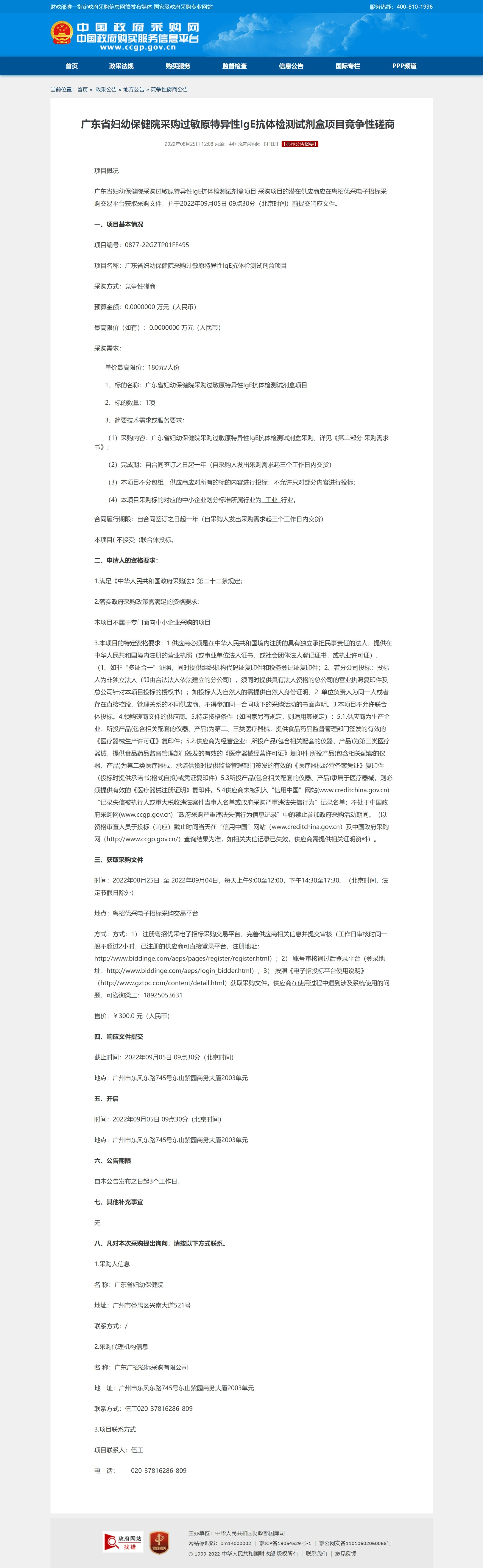 广东省妇幼保健院采购过敏原特异性IgE抗体检测试剂盒项目 采购项目的潜在供应商应在粤招优采电子招标采购交易平台获取采购文件,并于20220905 0930分(北京时间)前提交响应文件。