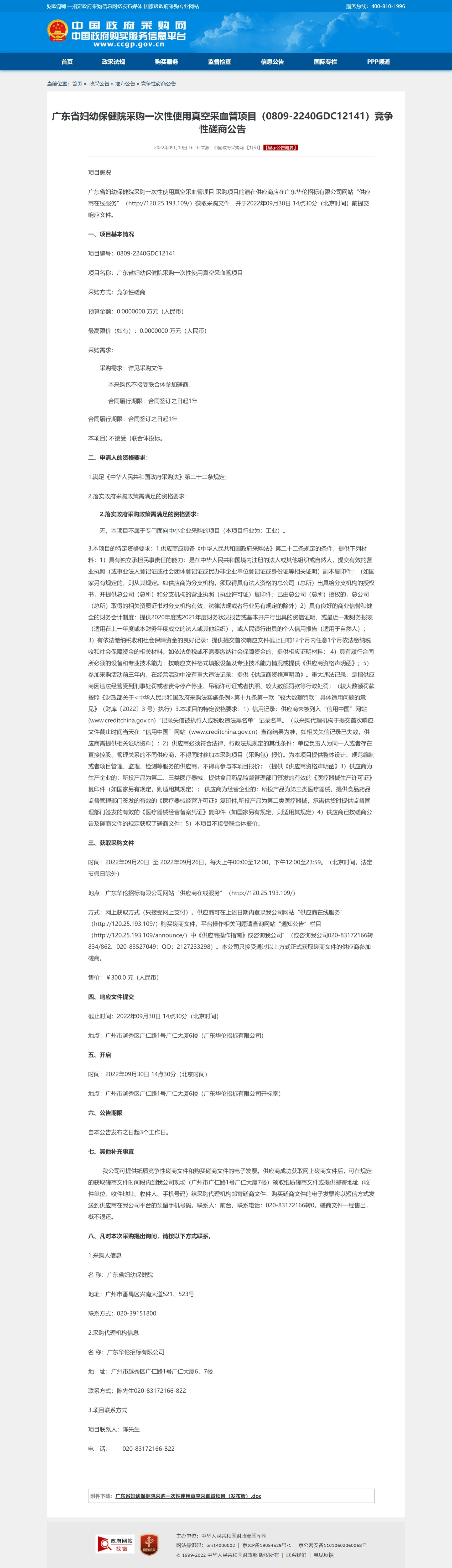 广东省妇幼保健院采购一次性使用真空采血管项目 采购项目的潜在供应商应在广东华伦招标有限公司网站“供应商在线服务”(http://120.25.193.109/)获取采购文件,并于2022年09月30日 14点30分(北京时间)前提交响应文件。