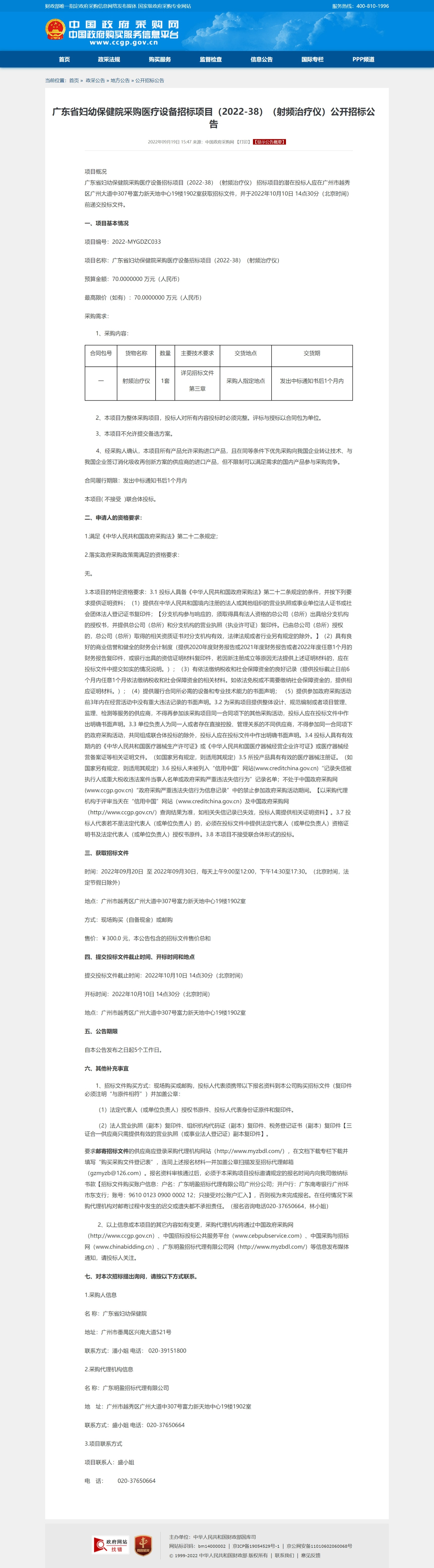 广东省妇幼保健院采购医疗设备招标项目(2022-38)(射频治疗仪) 招标项目的潜在投标人应在广州市越秀区广州大道中307号富力新天地中心19楼1902室获取招标文件,并于2022年10月10日 14点30分(北京时间)前递交投标文件。