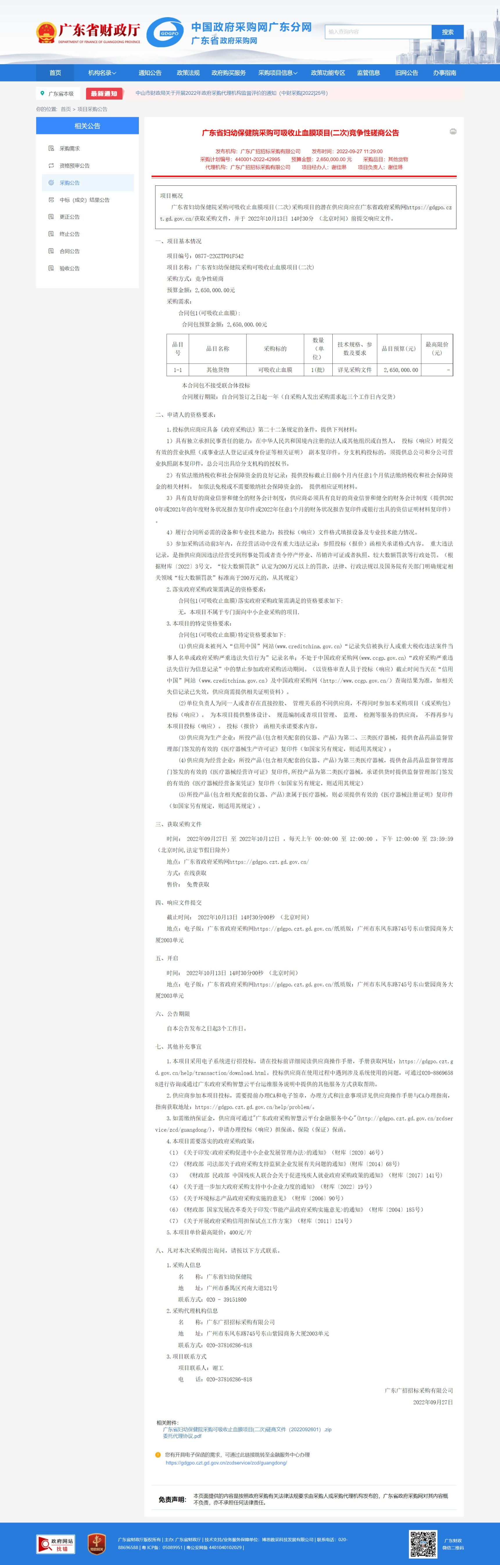 广东省妇幼保健院采购可吸收止血膜项目(二次)采购项目的潜在供应商应在广东省政府采购网https://gdgpo.czt.gd.gov.cn/获取采购文件,并于 2022年10月13日 14时30分 (北京时间)前提交响应文件。