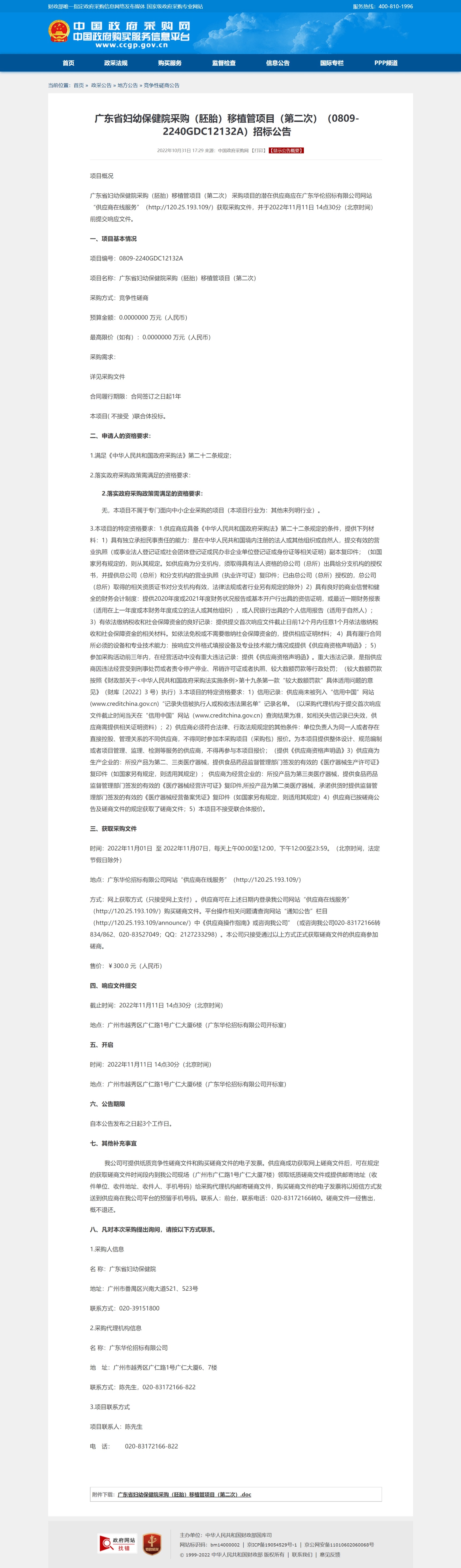 广东省妇幼保健院采购(胚胎)移植管项目(第二次) 采购项目的潜在供应商应在广东华伦招标有限公司网站“供应商在线服务”(http://120.25.193.109/)获取采购文件,并于2022年11月11日 14点30分(北京时间)前提交响应文件。