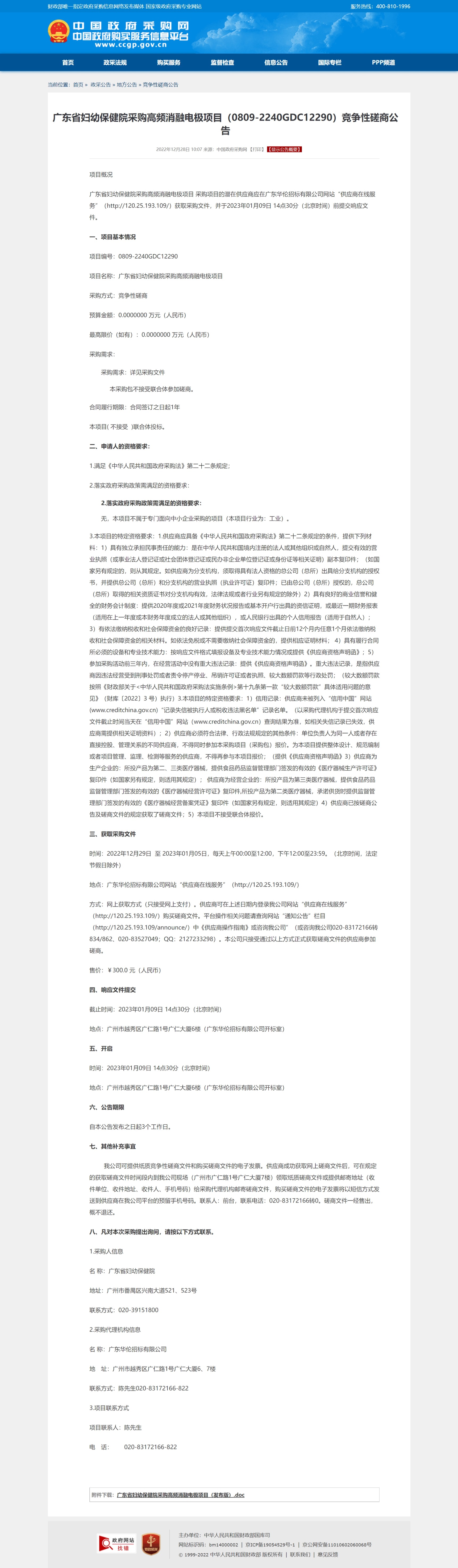 广东省妇幼保健院采购高频消融电极项目 采购项目的潜在供应商应在广东华伦招标有限公司网站“供应商在线服务”(http://120.25.193.109/)获取采购文件,并于2023年01月09日 14点30分(北京时间)前提交响应文件。
