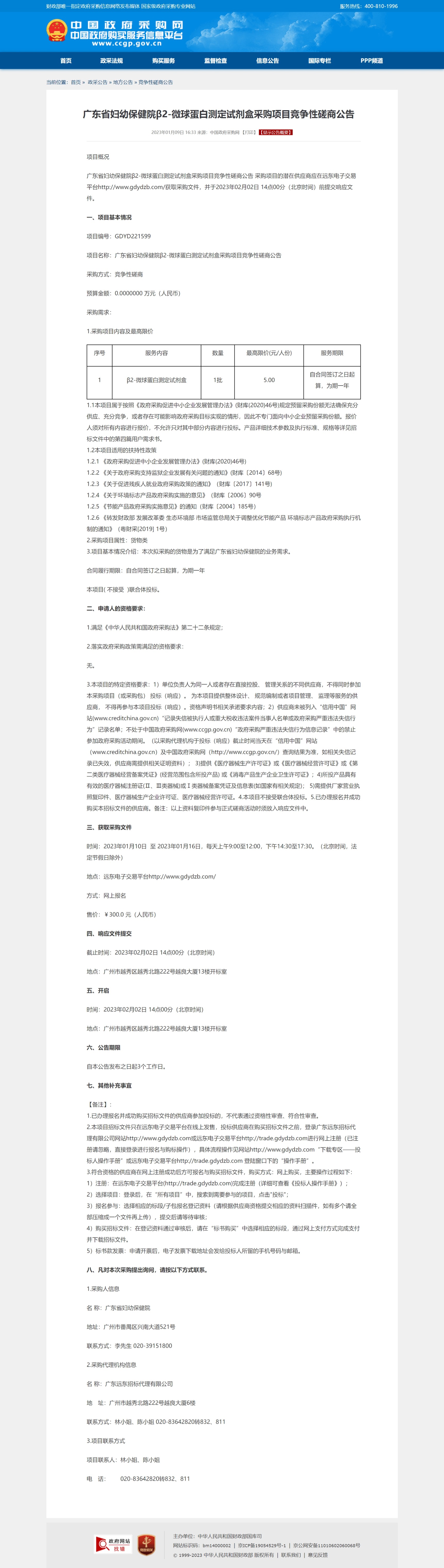 项目名称:广东省妇幼保健院β2-微球蛋白测定试剂盒采购项目竞争性磋商公告