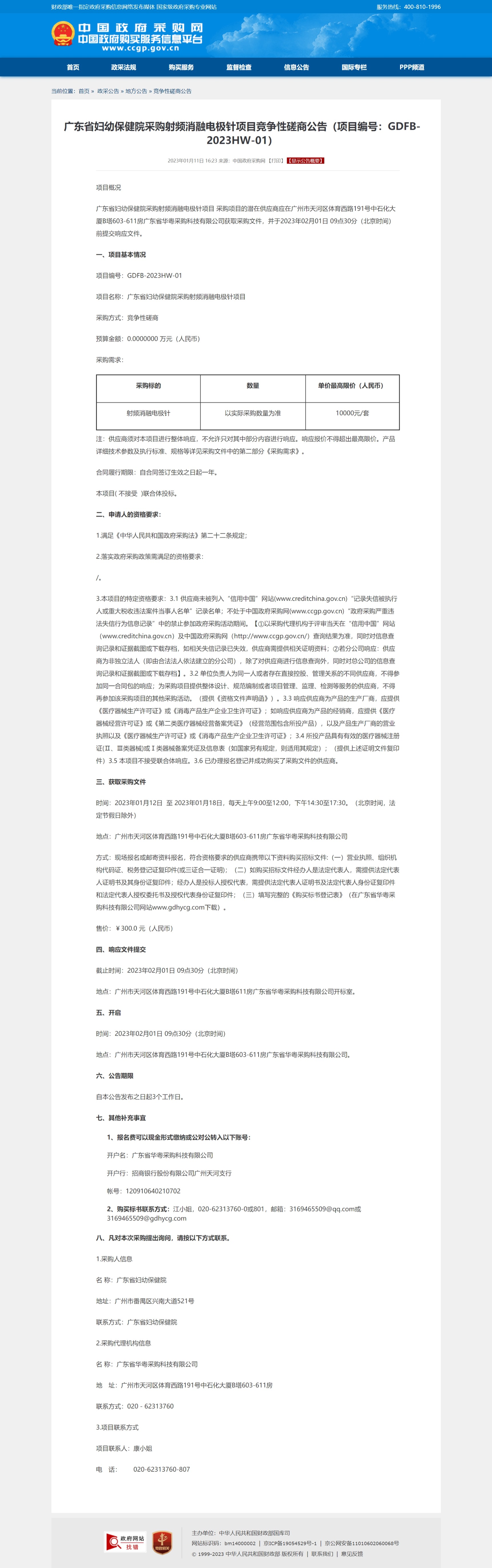 广东省妇幼保健院采购射频消融电极针项目 采购项目的潜在供应商应在广州市天河区体育西路191号中石化大厦B塔603-611房广东省华粤采购科技有限公司获取采购文件,并于2023年02月01日 09点30分(北京时间)前提交响应文件。