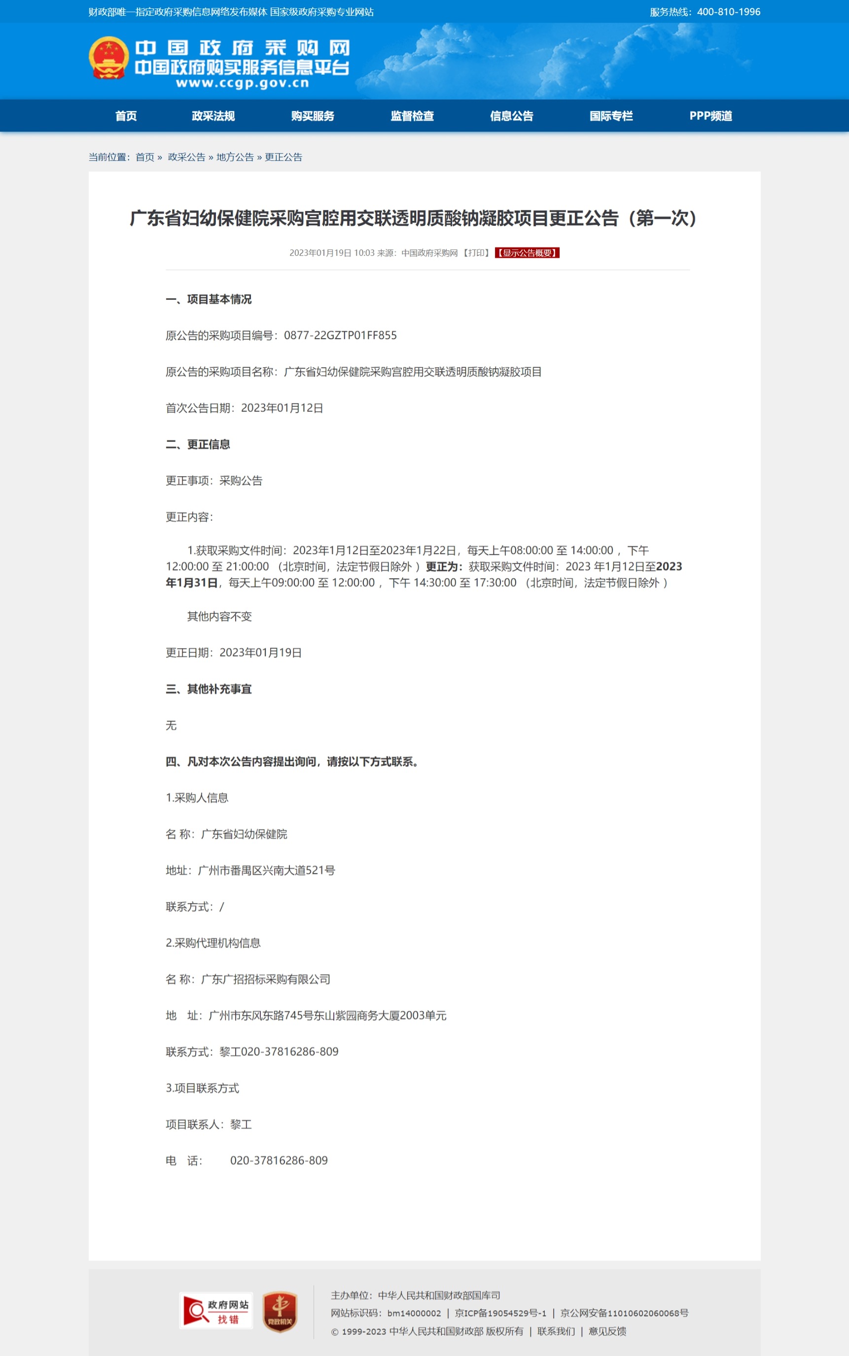 原公告的采购项目名称:广东省妇幼保健院采购宫腔用交联透明质酸钠凝胶项目