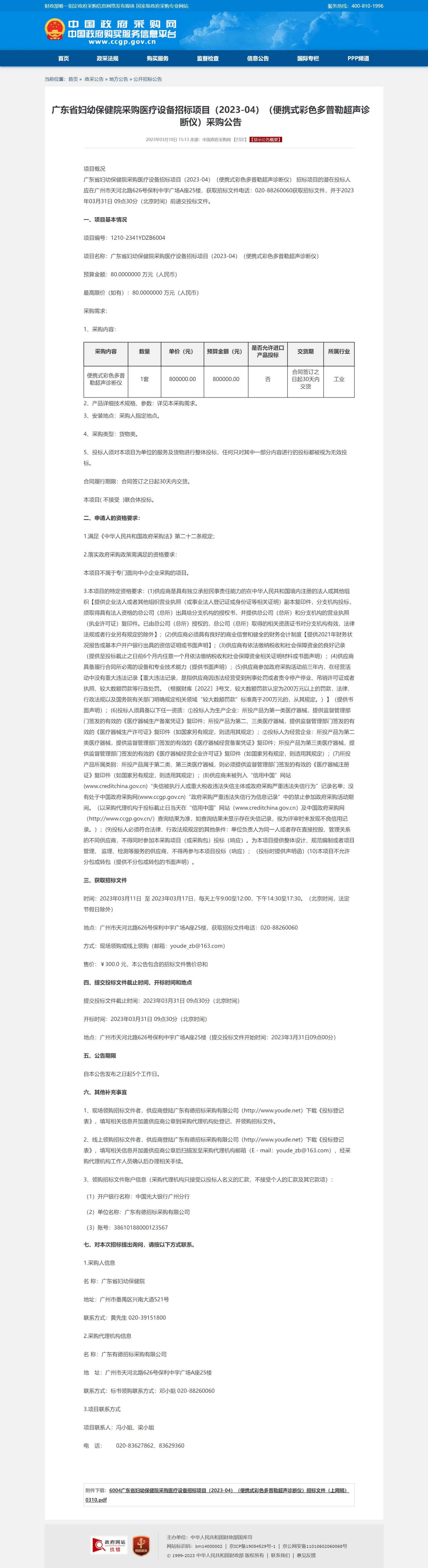 广东省妇幼保健院采购医疗设备招标项目(2023-04)(便携式彩色多普勒超声诊断仪) 招标项目的潜在投标人应在广州市天河北路626号保利中宇广场A座25楼,获取招标文件电话:020-88260060获取招标文件,并于2023年03月31日 09点30分(北京时间)前递交投标文件。