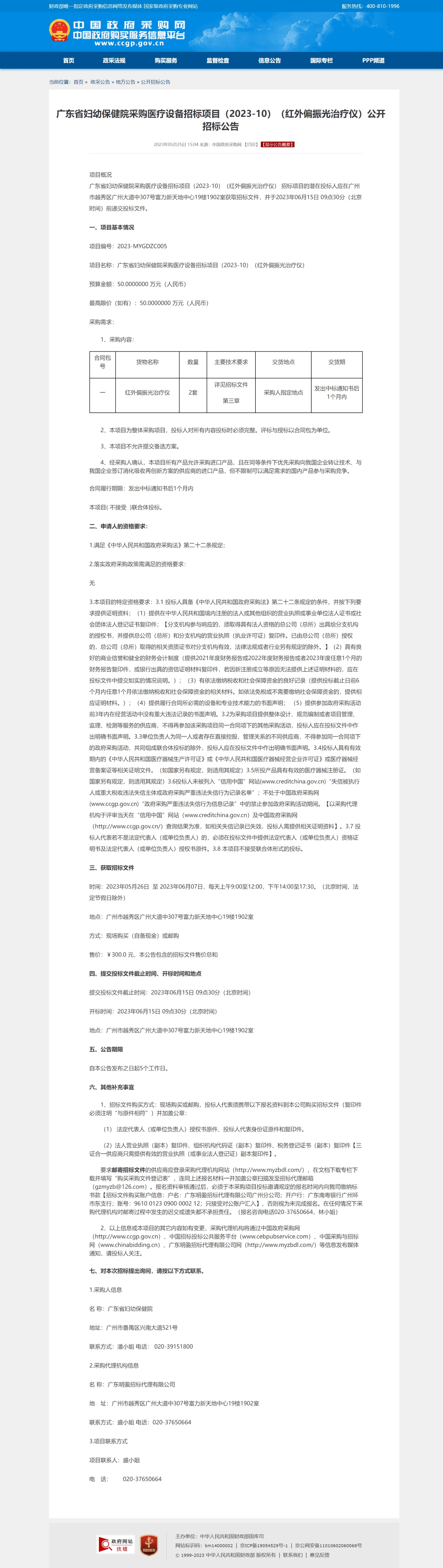 广东省妇幼保健院采购医疗设备招标项目(2023-10)(红外偏振光治疗仪)公开招标公告