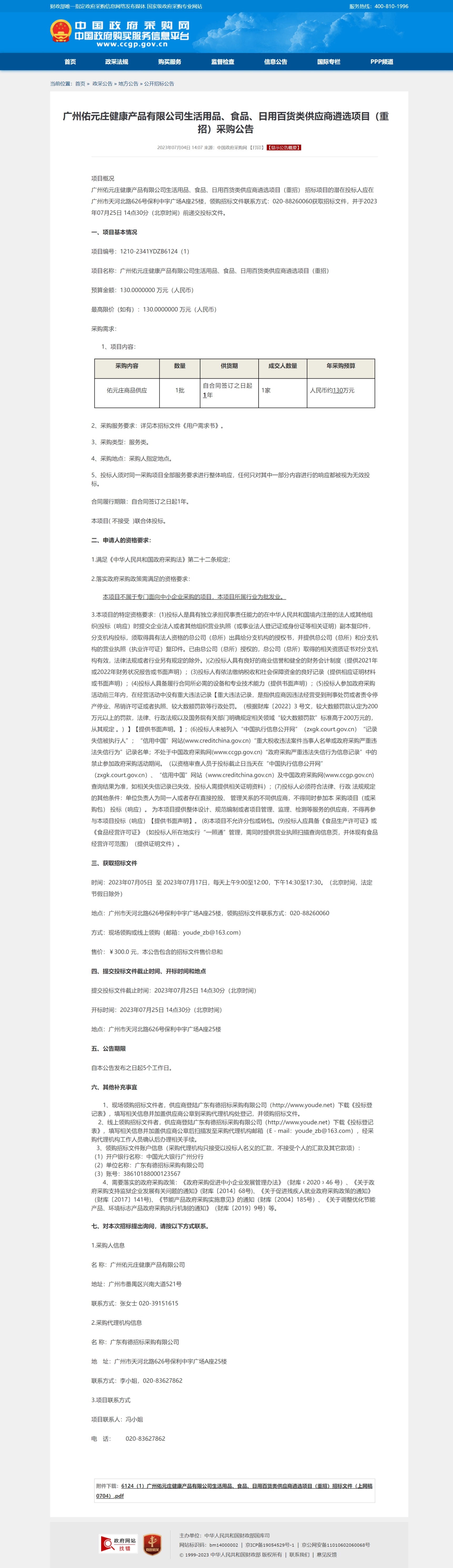 项目名称:广州佑元庄健康产品有限公司生活用品、食品、日用百货类供应商遴选项目(重招)