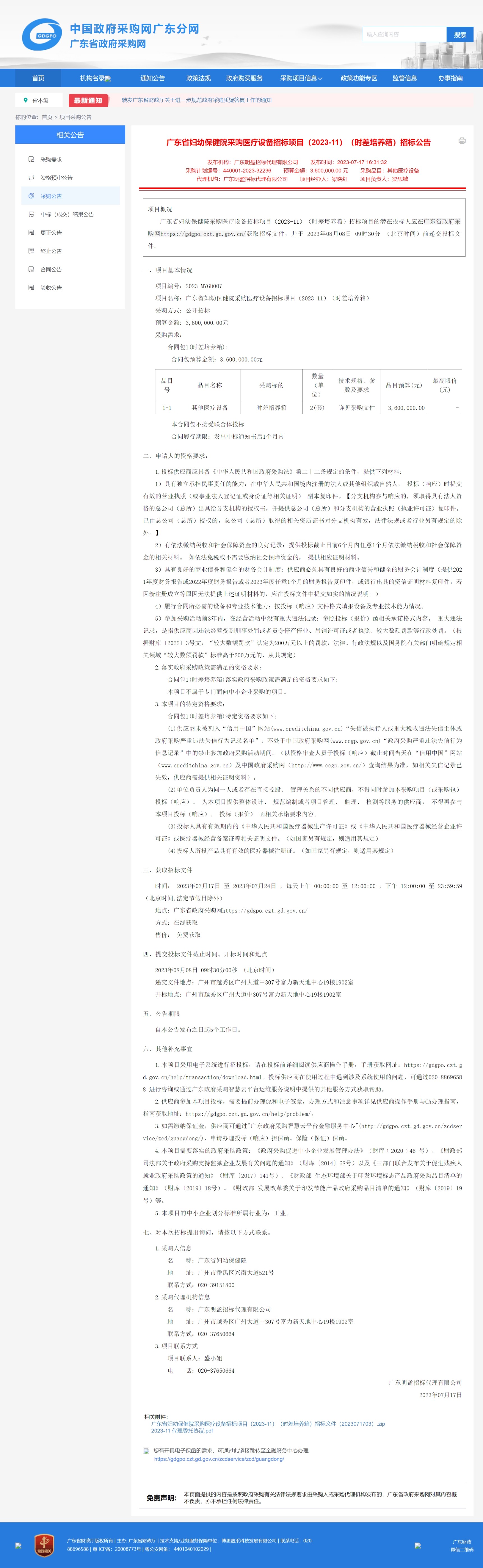 广东省妇幼保健院采购医疗设备招标项目(2023-11)(时差培养箱)招标项目的潜在投标人应在广东省政府采购网https://gdgpo.czt.gd.gov.cn/获取招标文件,并于 2023年08月08日 09时30分 (北京时间)前递交投标文件。